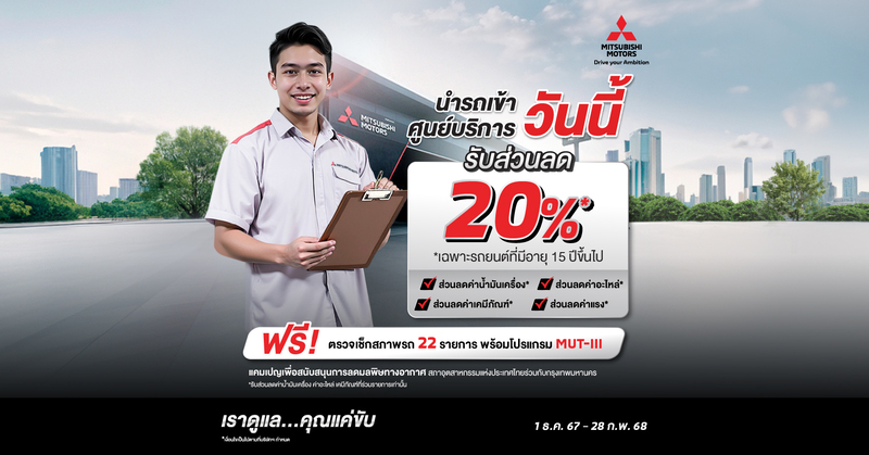 รถเก่า เราก็ดูแล! มิตซูบิชิ มอเตอร์ส ยกระดับการให้บริการหลังการขาย ด้วยข้อเสนอ ส่วนลดร้อยละ 20 สำหรับค่าแรงและค่าอะไหล่ที่ร่วมรายการ พร้อมฟรีเช็กรถ 22 รายการ และตรวจเช็กด้วยเครื่อง MUT-III เฉพาะรถยนต์มิตซูบิชิที่มีอายุ 15 ปีขึ้นไป
