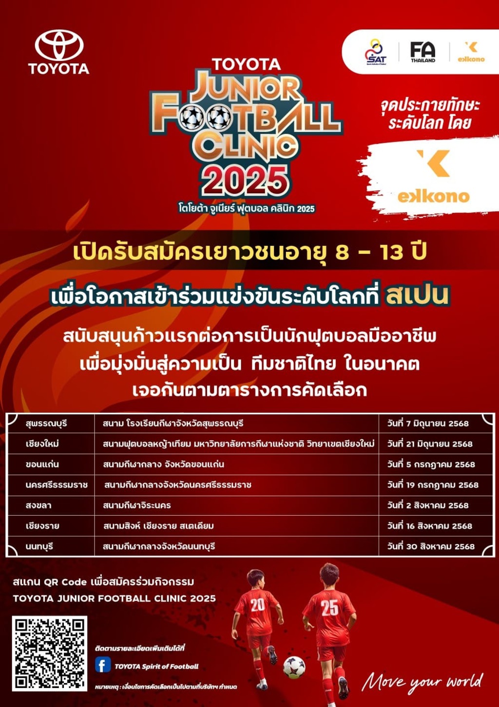 โตโยต้าสานต่อความมุ่งมั่น พัฒนาเยาวชนไทยสู่ฟุตบอลระดับโลก จัดโครงการ “TOYOTA Junior Football Clinic 2025” เดินสายเฟ้นหา 23 นักเตะเยาวชนไทย สู่ Training Camp และร่วมแข่งขันในรายการ Surf Cup Tournament & Johan Cruyff Tournament ที่ประเทศสเปน