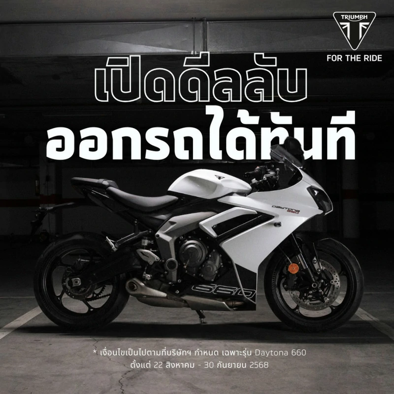 ไทรอัมพ์ มอเตอร์ไซเคิลส์ บุกงาน Big Motor Sale 2025 ชวนสาวกบิ๊กไบค์สัมผัสรถจักรยานยนต์ไทรอัมพ์ที่ขนทัพมาหลากหลายรุ่นยอดนิยมจัดเต็มทุกเซกเมนต์ พร้อมมอบข้อเสนอสุดพิเศษมากมายให้เป็นเจ้าของ ไม่ว่าจะเป็น กลุ่มรถจักรยานยนต์ Modern Classics อาทิ ตระกูล T-series ได้แก่ Speed 400 และ Scrambler 400 X ตระกูล Bonneville เช่น Speed Twin 900, Bonneville T100, Bonneville T120 กลุ่มรถจักรยานยนต์ Rocket 3 รวมถึงกลุ่มรถจักรยานยนต์ Roadster / Sport เช่น Trident 660, Speed Triple 1200 RR ตลอดจนกลุ่มรถจักรยานยนต์ Adventure ตระกูล Tiger สุดพิเศษ! สำหรับรุ่น Daytona 660 เปิดดีลลับพร้อมออกรถได้ทันที รับฟรีประกันภัยชั้น 1 พร้อมข้อเสนอทางการเงินมูลค่าสูงถึง 65,460 บาท รวมมูลค่ากว่า 81,000 บาท พร้อมกันนี้ยังสามารถช้อปเสื้อผ้าและอุปกรณ์สวมใส่ที่ลดสูงสุดถึง 40% เฉพาะภายในงานเท่านั้น พบกันได้ที่ บูธไทรอัมพ์ A34 ไบเทคบางนา ระหว่างวันที่ 22 – 31 สิงหาคม 2568