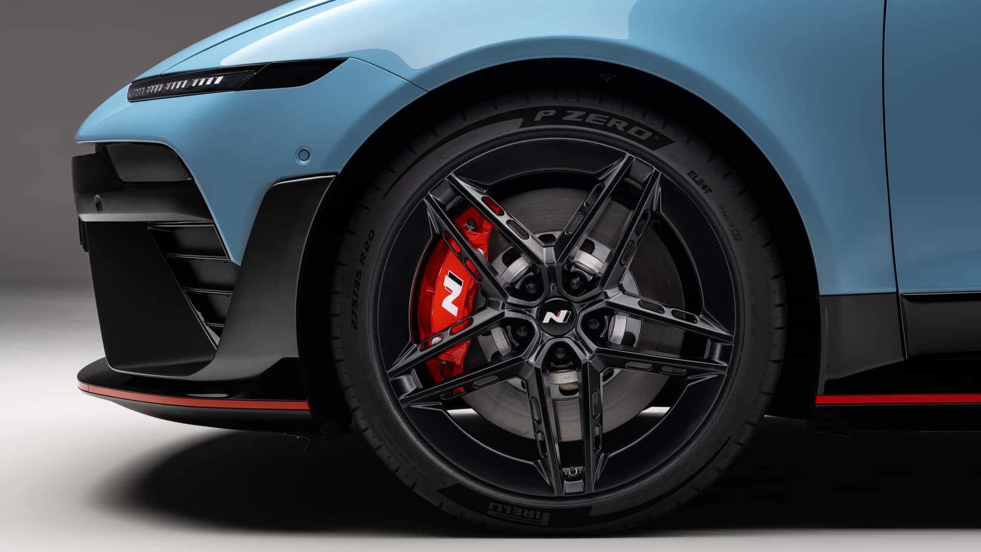 Ioniq 6 N มาพร้อมจานเบรกหน้าขนาด 15.7 นิ้ว (4 พอต) และหลัง 14.1 นิ้ว (1 พอต) ใช้ล้อขนาด 20 นิ้วหุ้มด้วยยาง Pirelli P-Zero 275/35R20 ที่พัฒนาขึ้นเป็นพิเศษสำหรับรุ่นนี้