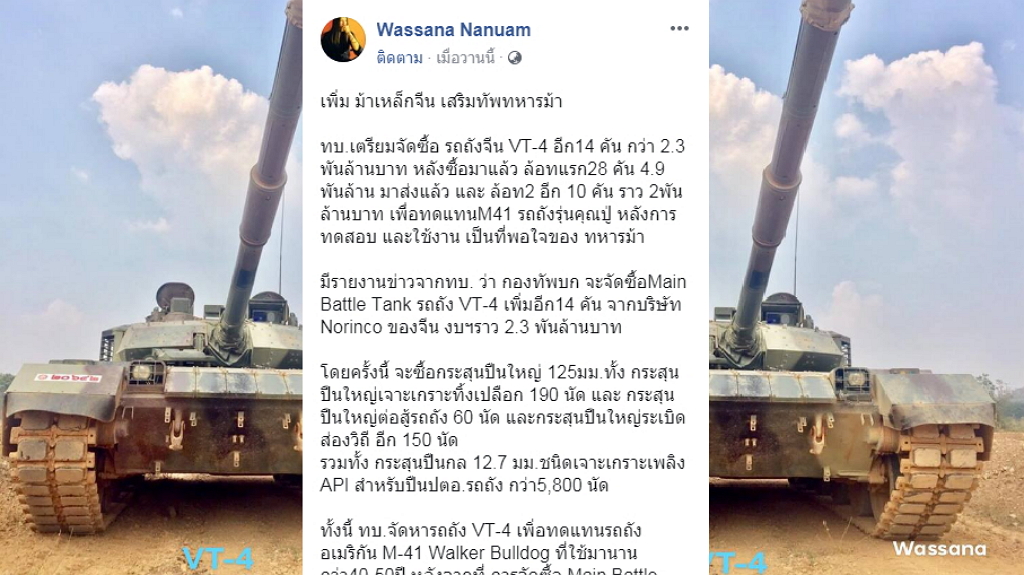 จากเฟซบุ๊ก Wassana Nanuam ผู้สื่อข่าวสายทหาร รายงานว่า กองทัพบก (ทบ.) จะจัดซื้อรถถังหลัก (Main Battle Tank) เป็นรถถัง VT-4 เพิ่มอีก 14 คัน จากบริษัท Norinco ของจีน เบื้องต้นใช้งบประมาณราว 2.3 พันล้านบาท