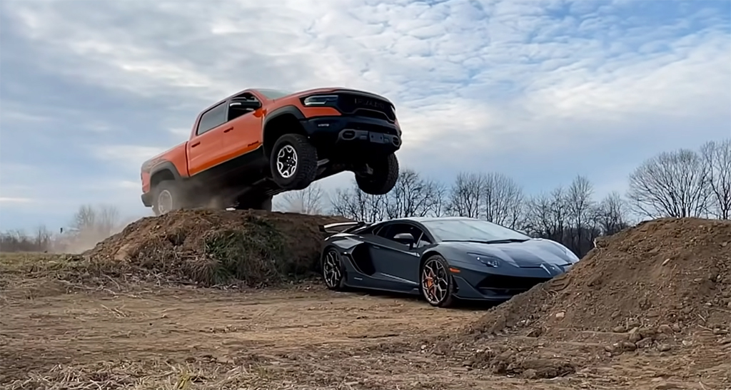 ยูทุปเบอร์ขับ Ram TRX โดดข้าม Lamborghini บอกเลยงานนี้ไม่รอดก็เละ