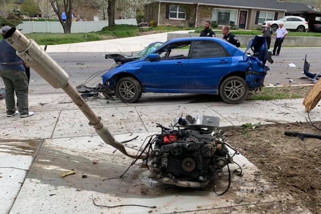 สงสัยจะแรงจัด Subaru WRX เกิดอุบัติเหตุจนเครื่องกระเด็นออกมาอยู่ข้างถนน